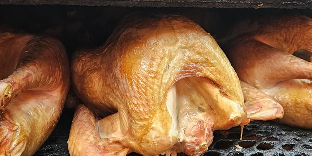 Starting at 13 to 15 lbs, we brine your Turkey overnight before smoking to make it the best, moist turkey you've ever tasted. Feeds 12 to 15 people. Please add $10 if you'd like us to carve it for you.